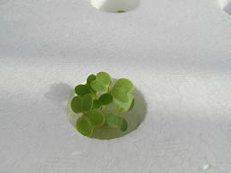 チンゲン菜とサラダ菜を交互に植えました。はじめての水耕栽培で、ためしに植えてみたところ、想像以上に植えた種は全て発芽しました。 |